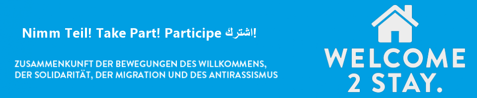 Am kommenden Samstag, 18.03.2017 beginnen die Welcome2Stay Aktionstage. Bundesweit wird es in 13 Städten vielfältigen Protest und Aktionen geben: für das Recht, zu kommen, zu gehen und zu bleiben, sowie gleiche soziale Rechte für alle. Europaweit folgen außerdem weitere 29 Städte dem internationalen Aufruf vom City Plaza Hotel in Athen.